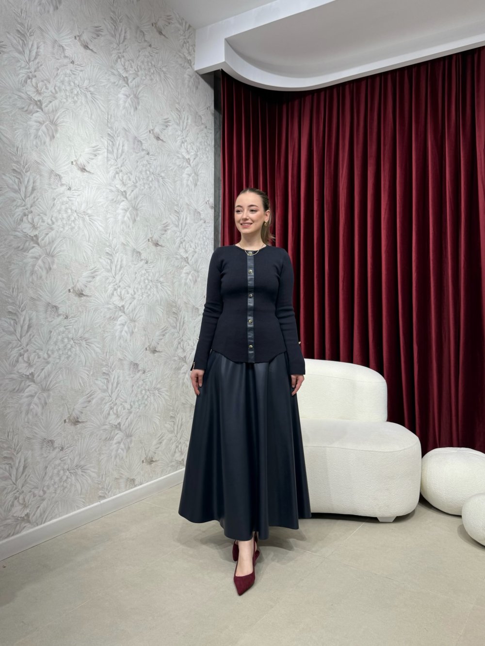 Bluz triko kumaştan üretilmiştir. Ön kısmı deri ve düğme detaylıdır. Kollarda aksesuar düğme ve yırtmaç detayı mevcuttur.