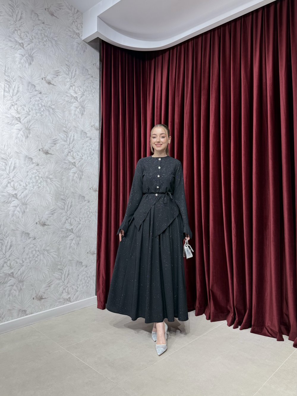 Ürünümüz simli modal kumaştan üretilmiştir. Tunik bisiklet yaka, önden pasif aksesuar düğme detaylı, kollar volanlı olup asimetrik kesime sahiptir.