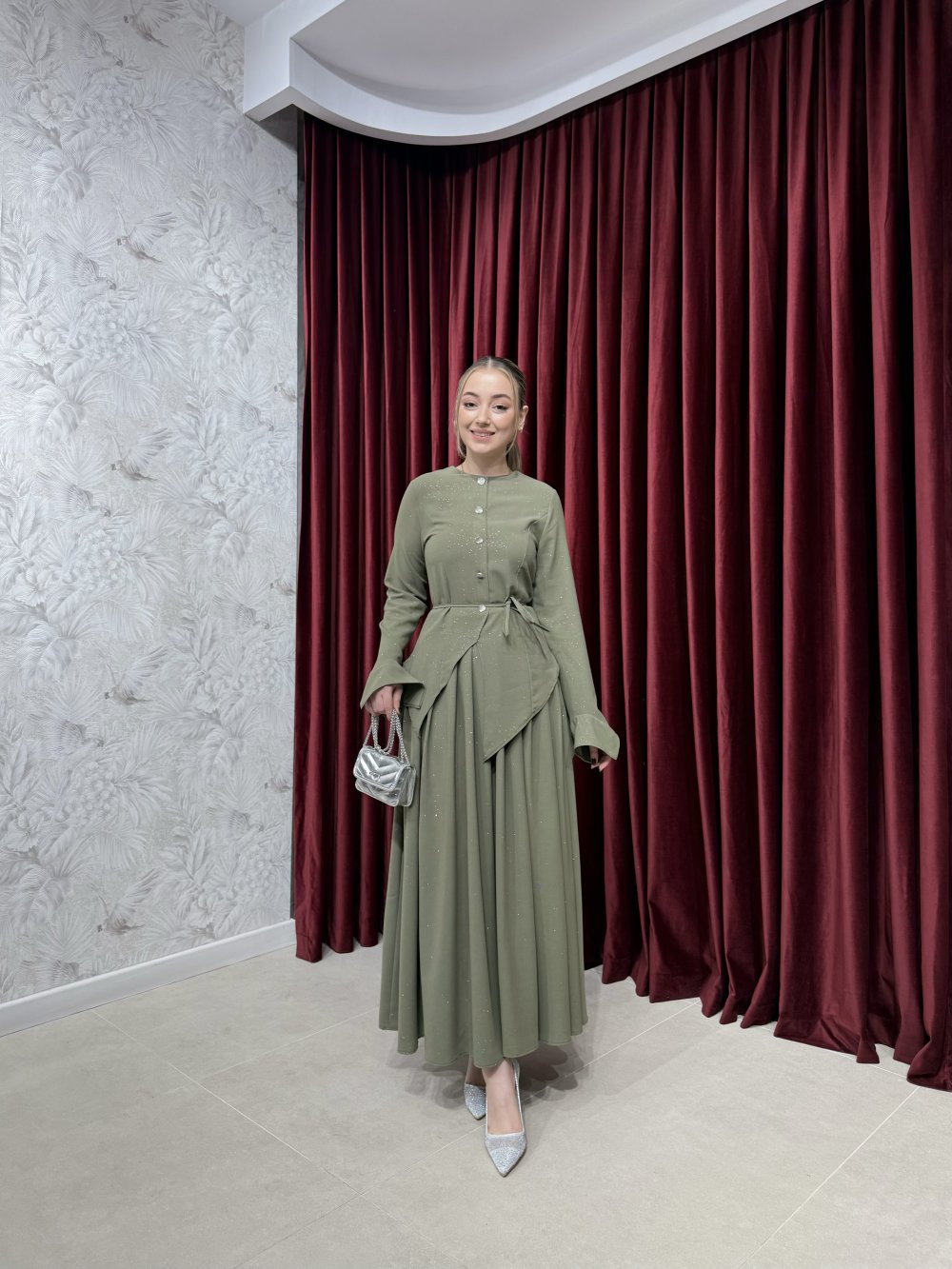 Ürünümüz simli modal kumaştan üretilmiştir. Tunik bisiklet yaka, önden pasif aksesuar düğme detaylı, kollar volanlı olup asimetrik kesime sahiptir.