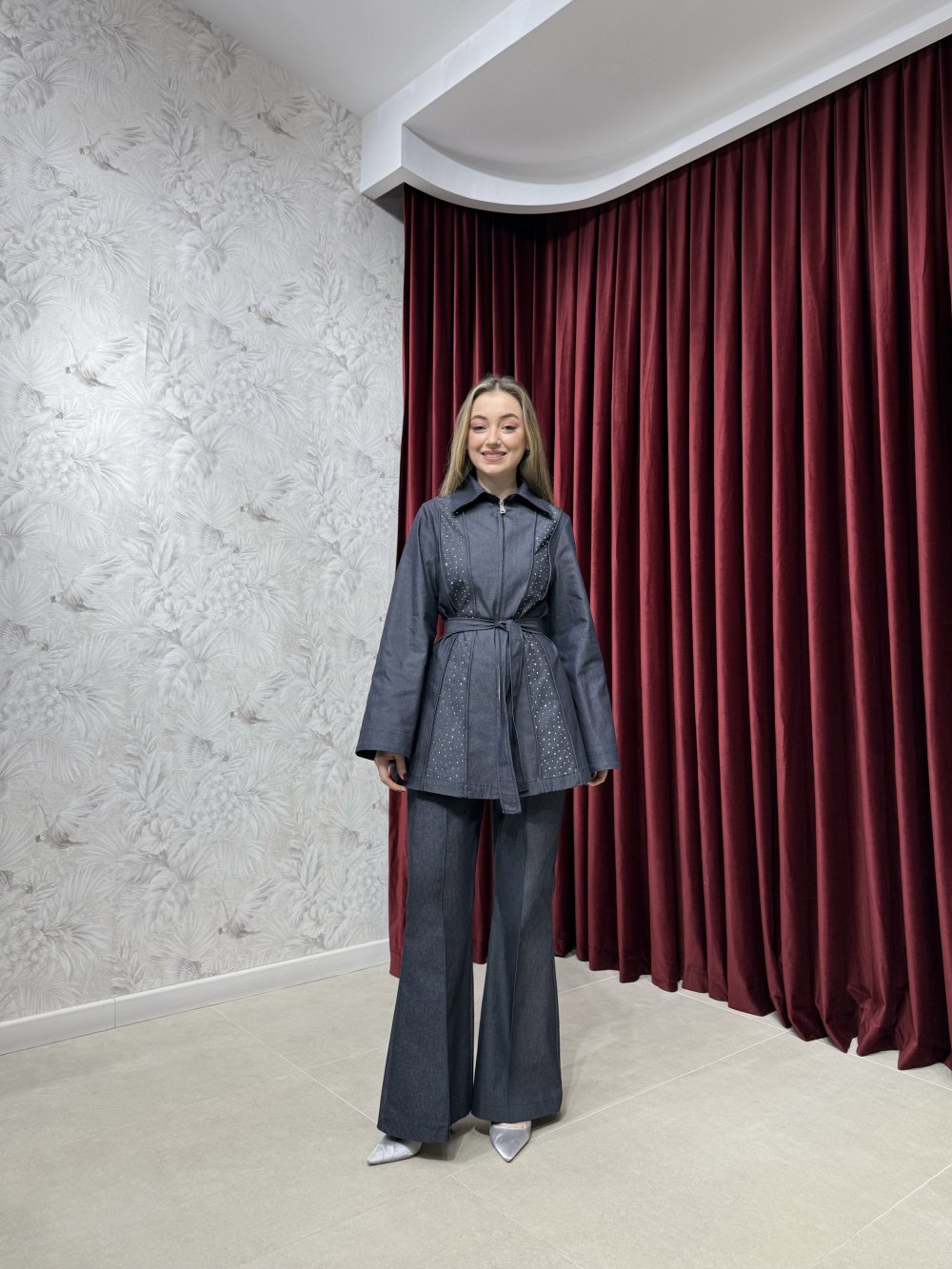 Ürünümüz denim kumaştan üretilmiştir. Ceket klasik yaka, boydan fermuarlı, taş işleme detaylı, aktif iki cepli olup seyyar kuşak ile birlikte gönderilmektedir.
