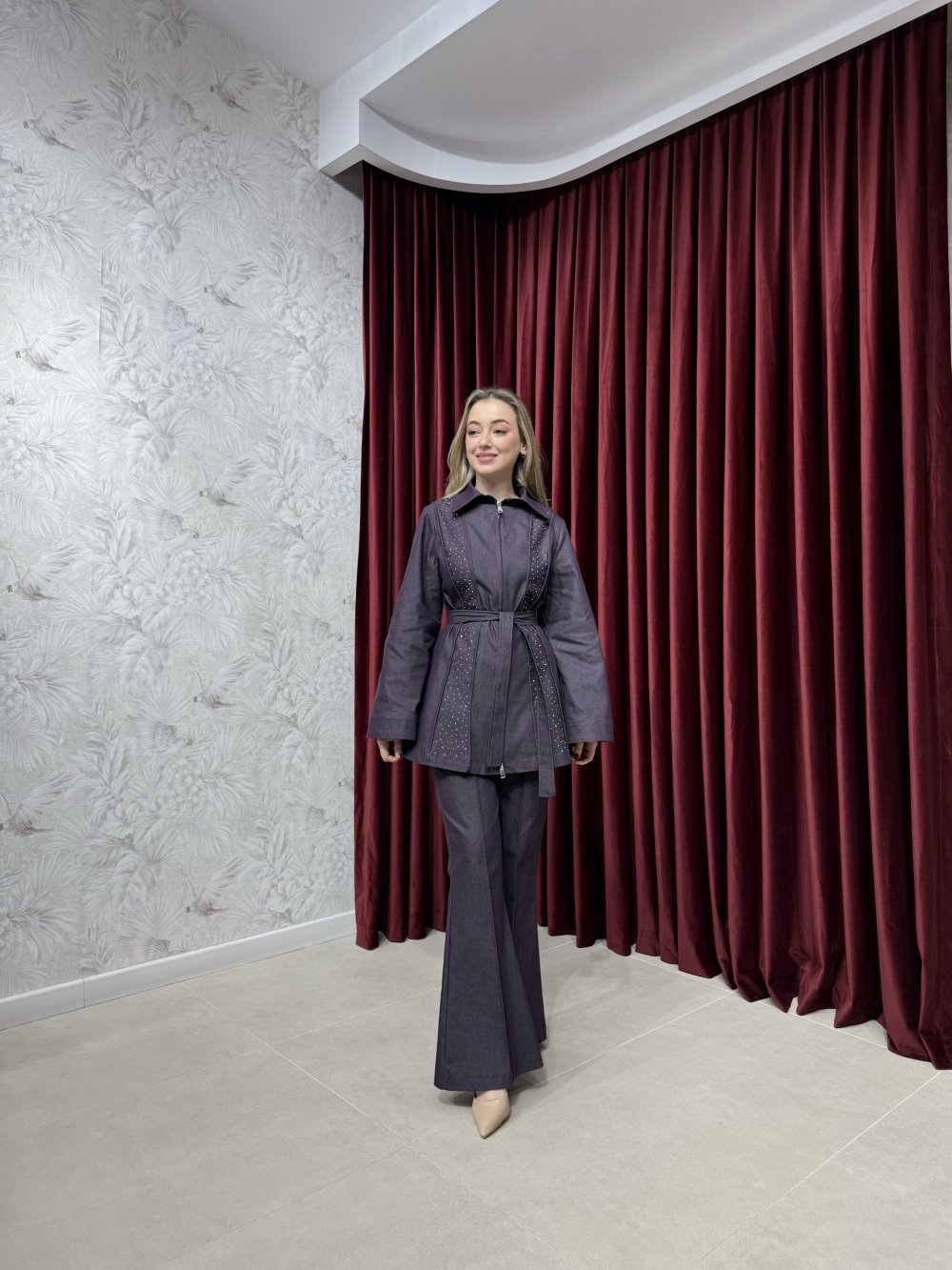 Ürünümüz denim kumaştan üretilmiştir. Ceket klasik yaka, boydan fermuarlı, taş işleme detaylı, aktif iki cepli olup seyyar kuşak ile birlikte gönderilmektedir.