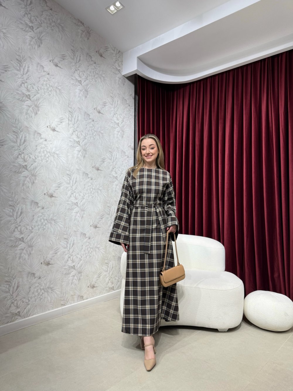 Bisiklet yaka, arkadan gizli fermuarlı, geniş kollu olup yanlardan birleşik kuşak kemerlidir.
