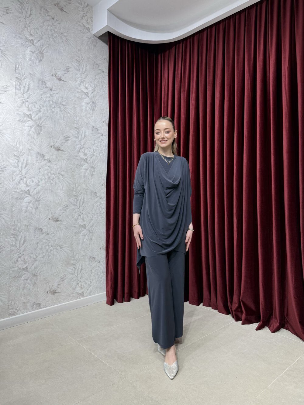 Ürünümüz sandy kumaştan üretilmiştir. Tunik bisiklet yaka, önden birleşik pelerin detaylı olup asimetrik kesime sahiptir.