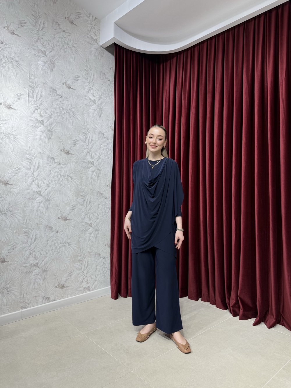 Ürünümüz sandy kumaştan üretilmiştir. Tunik bisiklet yaka, önden birleşik pelerin detaylı olup asimetrik kesime sahiptir.