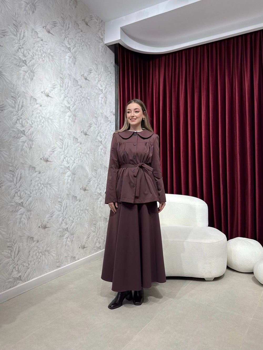 Bebe yaka, boydan düğmeli, robalı kesime sahip olup iki aktif cep mevcuttur.