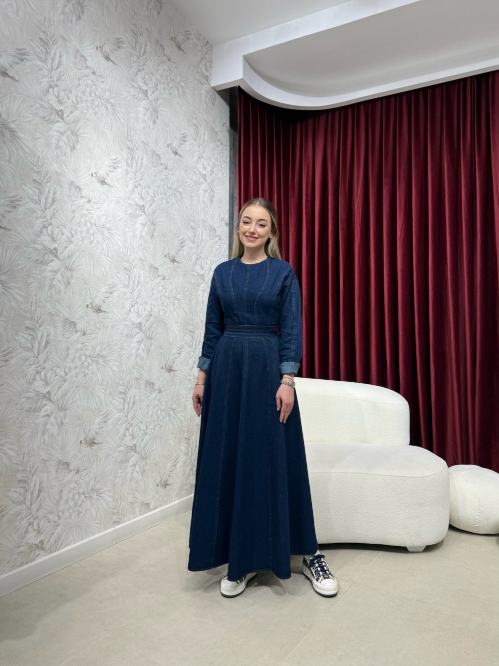 Ürünümüz denim kumaştan üretilmiştir. Belden oturtmalıdır. Sırt kısmı fermuarlıdır. Kollar manşetlidir.