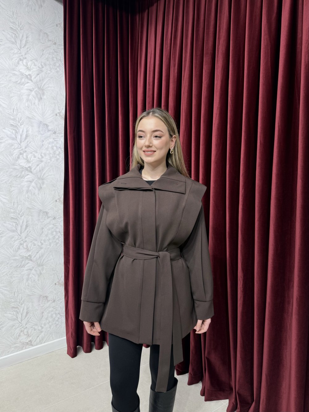 Ürünümüz natural trenç kumaştan üretilmiştir. Büyük dik yaka, boydan gizli düğmeli, omuzlar düğme detaylı olup seyyar kuşak ile birlikte gönderilmektedir. Tamamı astarlıdır.