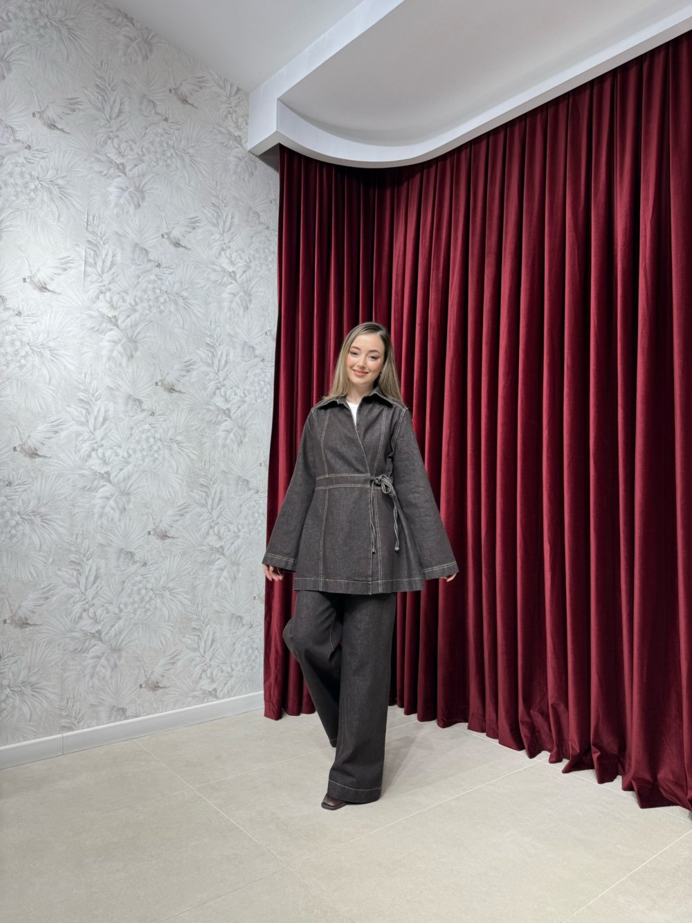 Ürünümüz denim kumaştan üretilmiştir. Klasik yaka, önden tek düğmeli ve bağlamalıdır.