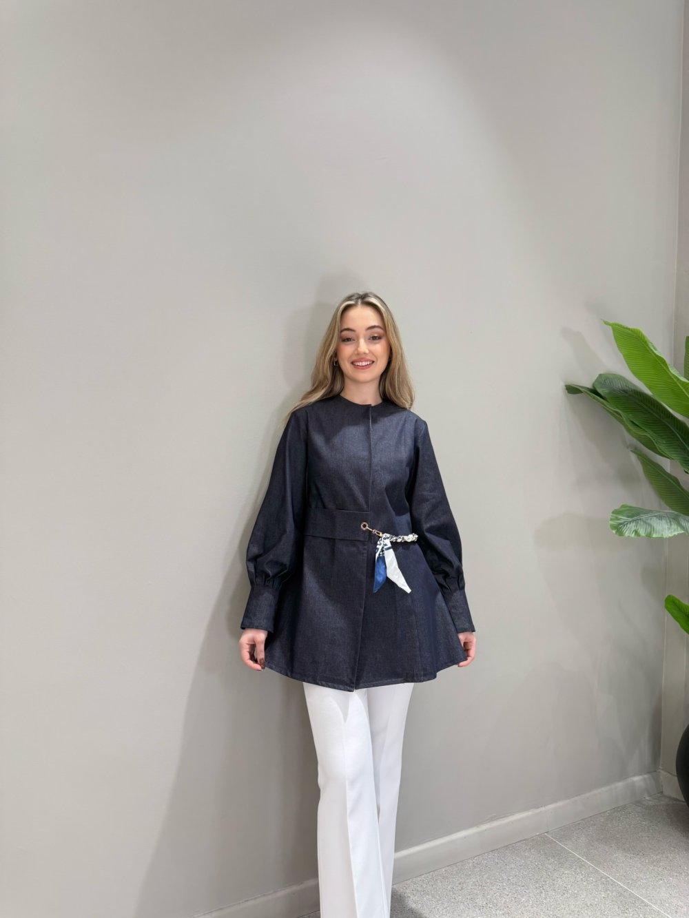 Ürünümüz denim kumaştan üretilmiştir. Bisiklet yaka, önden gizli iki tane çıtçıt düğmeli, bel kısmı seyyar fular zincir detaylı kancalıdır. Kol bilekleri dikiş detaylı pilelidir.