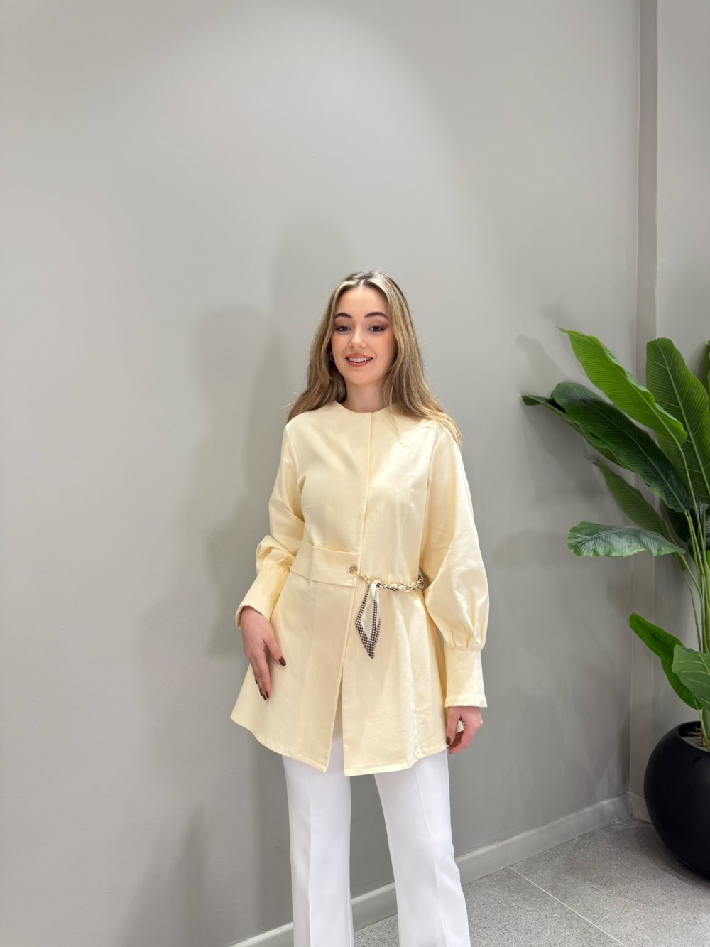 Ürünümüz denim kumaştan üretilmiştir. Bisiklet yaka, önden gizli iki tane çıtçıt düğmeli, bel kısmı seyyar fular zincir detaylı kancalıdır. Kol bilekleri dikiş detaylı pilelidir.