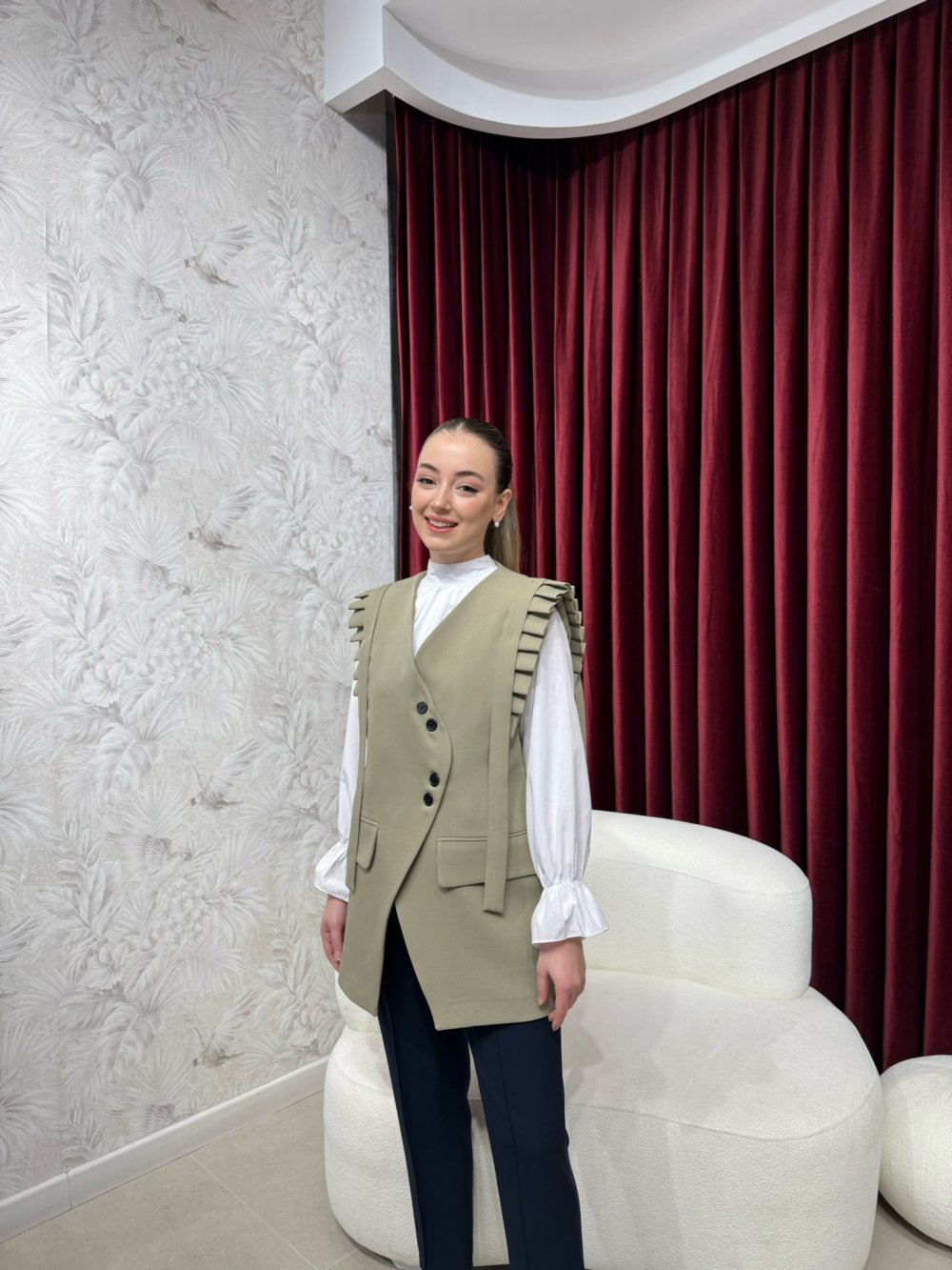 Ürünümüz krep kumaştan üretilmiştir. Önden asimetrik kesim düğmeli, aktif iki cepli, omuzlar pileli olup tamamı astarlıdır.