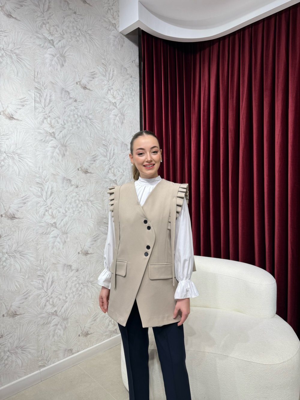 Ürünümüz krep kumaştan üretilmiştir. Önden asimetrik kesim düğmeli, aktif iki cepli, omuzlar pileli olup tamamı astarlıdır.