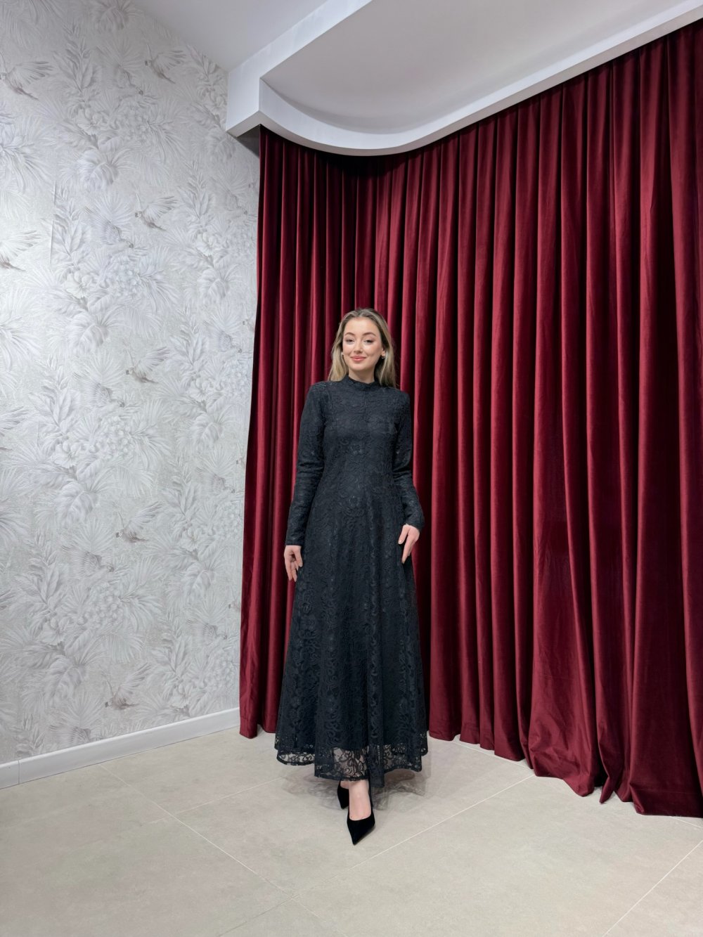 Ürünümüz dantel kumaştan üretilmiştir. Bisiklet dik yaka, vatkalı, arkadan fermuarlı ve düğmeli olup tamamı astarlıdır.