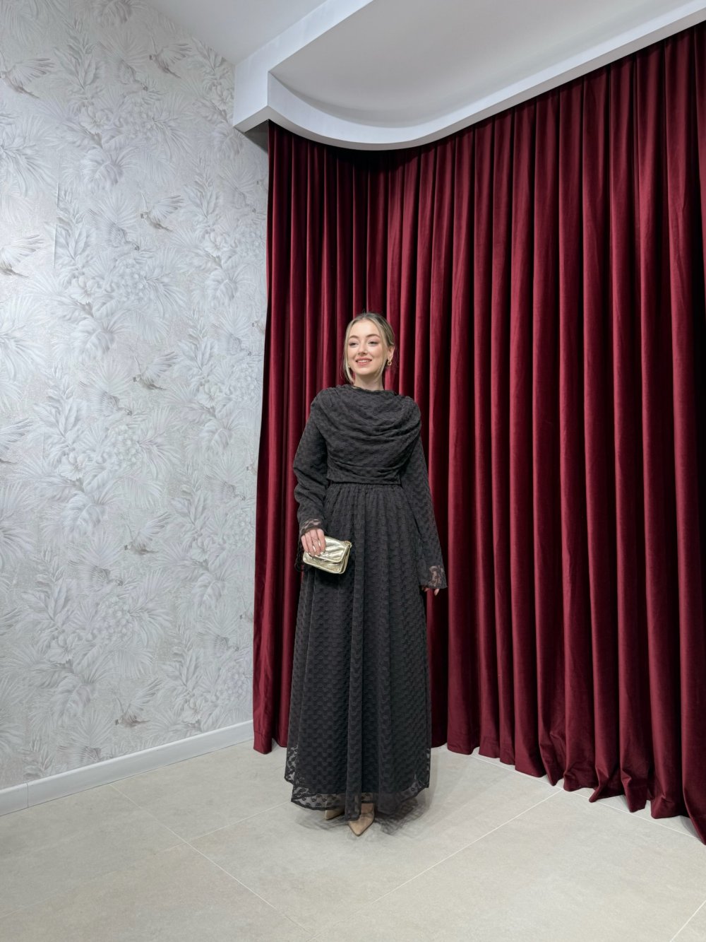 Ürünümüz dantel kumaştan üretilmiştir. Omuz kısımları pile detaylı, geniş kollu, arkadan fermuarlı olup tamamı astarlıdır.