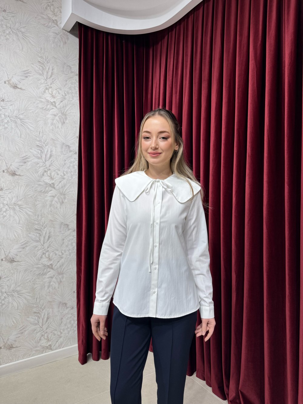 Ürünümüz poplin kumaştan üretilmiştir. Büyük yaka ip bağlamalı , boydan düğmeli, kollar manşetlidir.