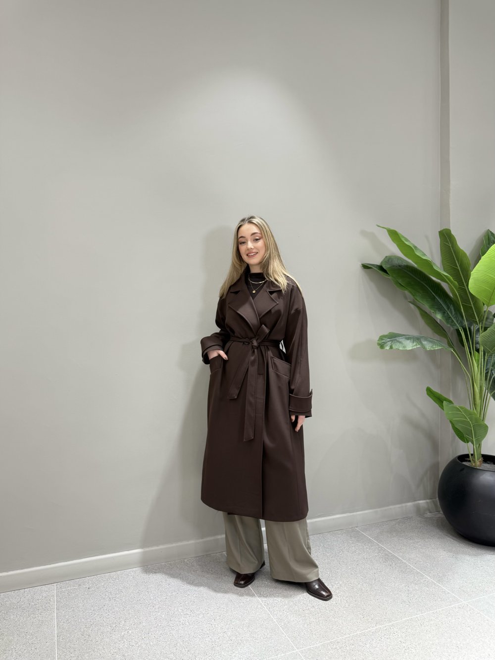 Ürünümüz natural trenç kumaştan üretilmiştir. Kruvaze yaka, aktif iki cepli, kollar kemer detaylı, tamamı astarlı olup seyyar kuşak ile birlikte gönderilmektedir.