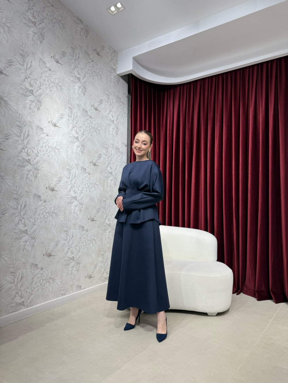 Ürünümüz scuba kumaştan üretilmiştir. Üst bisiklet yaka, belden pileli, yanlardan birleşik kuşak kemerli olup arkadan fermuarlıdır.
