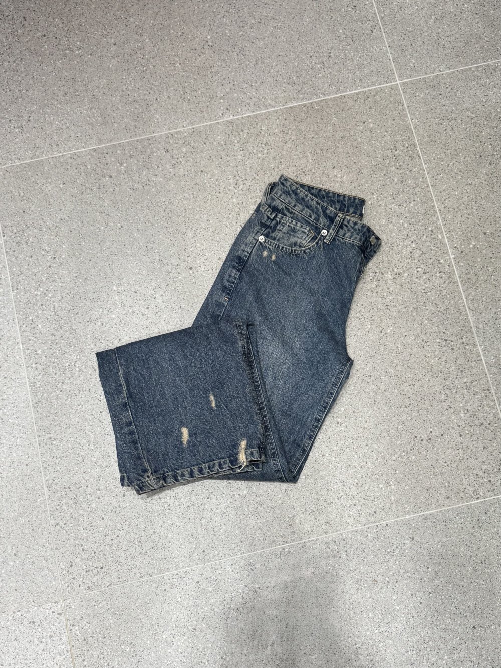 Ürünümüz denim kumaştan üretilmiştir. Yüksek bel, taş işlemeli, önde dört arka kısımda aktif iki cepli olup bol paça formundadır. Paça kısımları eskitme detaylıdır.