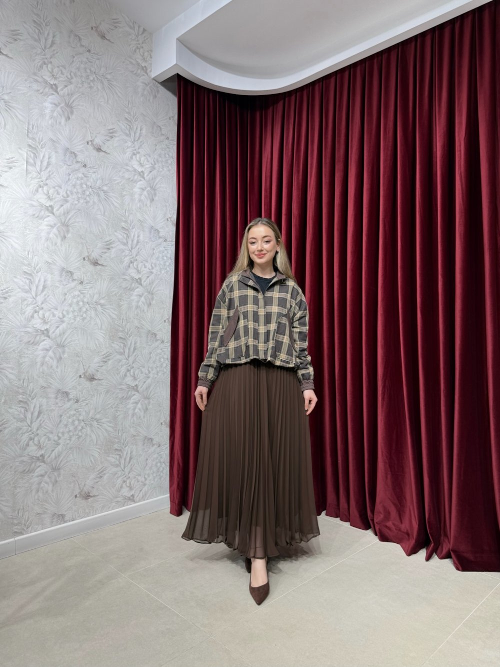 Etek şifon kumaştan üretilmiştir. Beli lastikli, ayarlanabilir tünel ipli olup piliseli kloş kesime sahiptir. Astarlıdır.