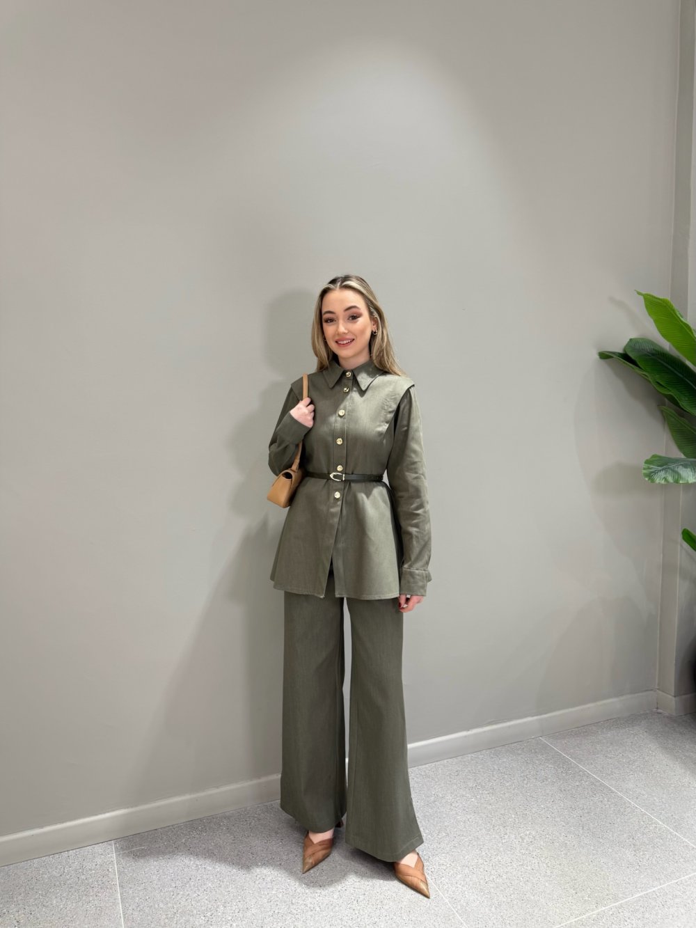 Gömlek klasik yaka, gold düğme detaylı, kollar manşetli olup seyyar deri kemer ile birlikte gönderilmektedir.