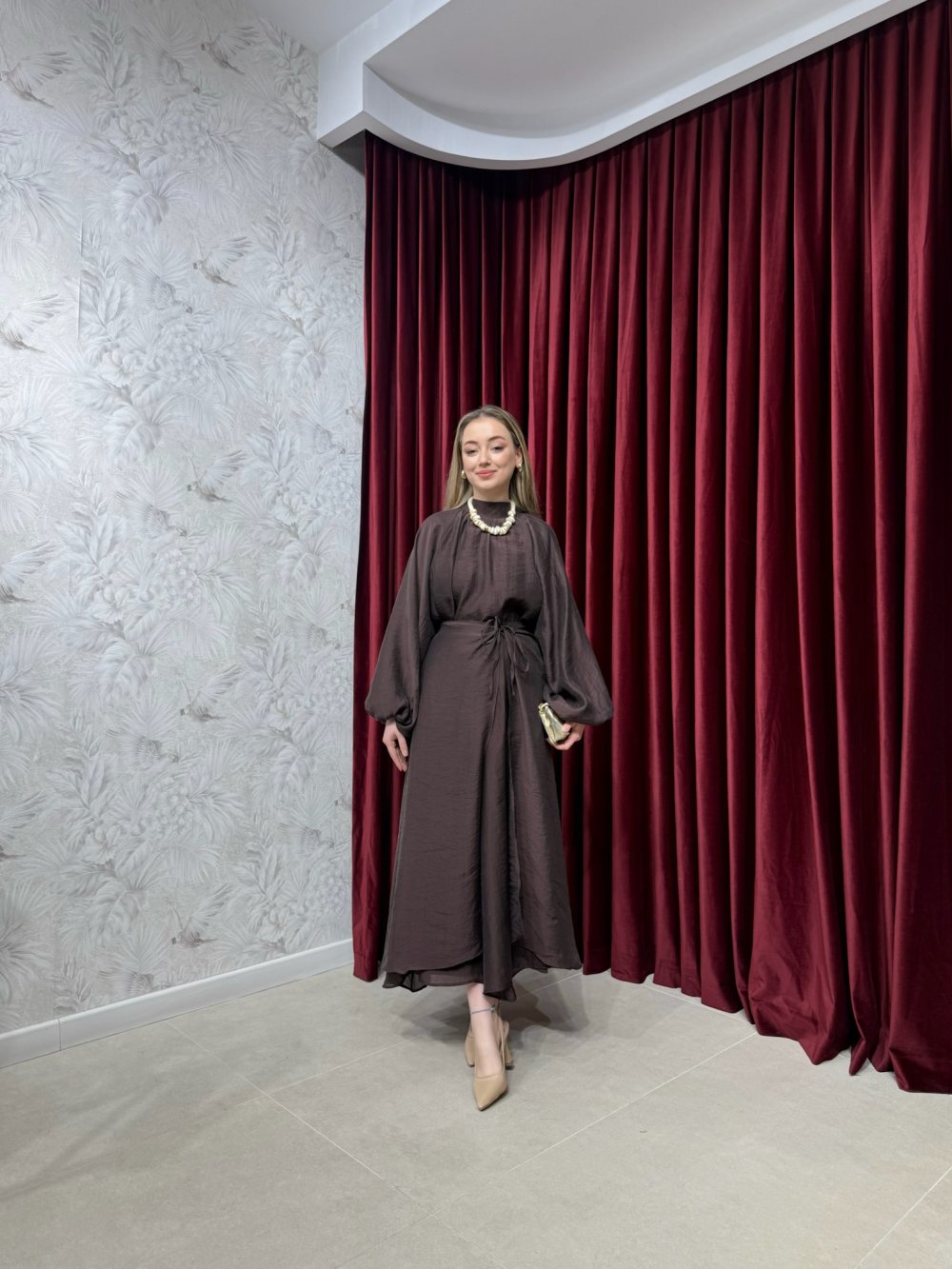 Tunik yuvarlak yaka, balon kol, kollar lastiklidir. Astarlıdır