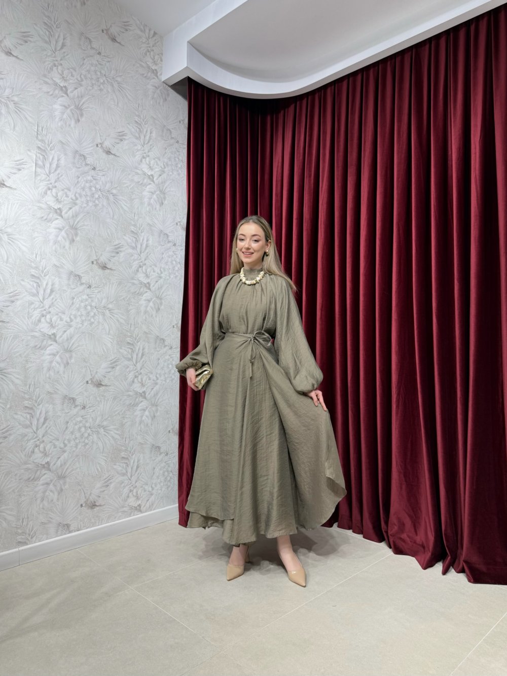 Tunik yuvarlak yaka,  balon kol, kollar lastiklidir. Astarlıdır