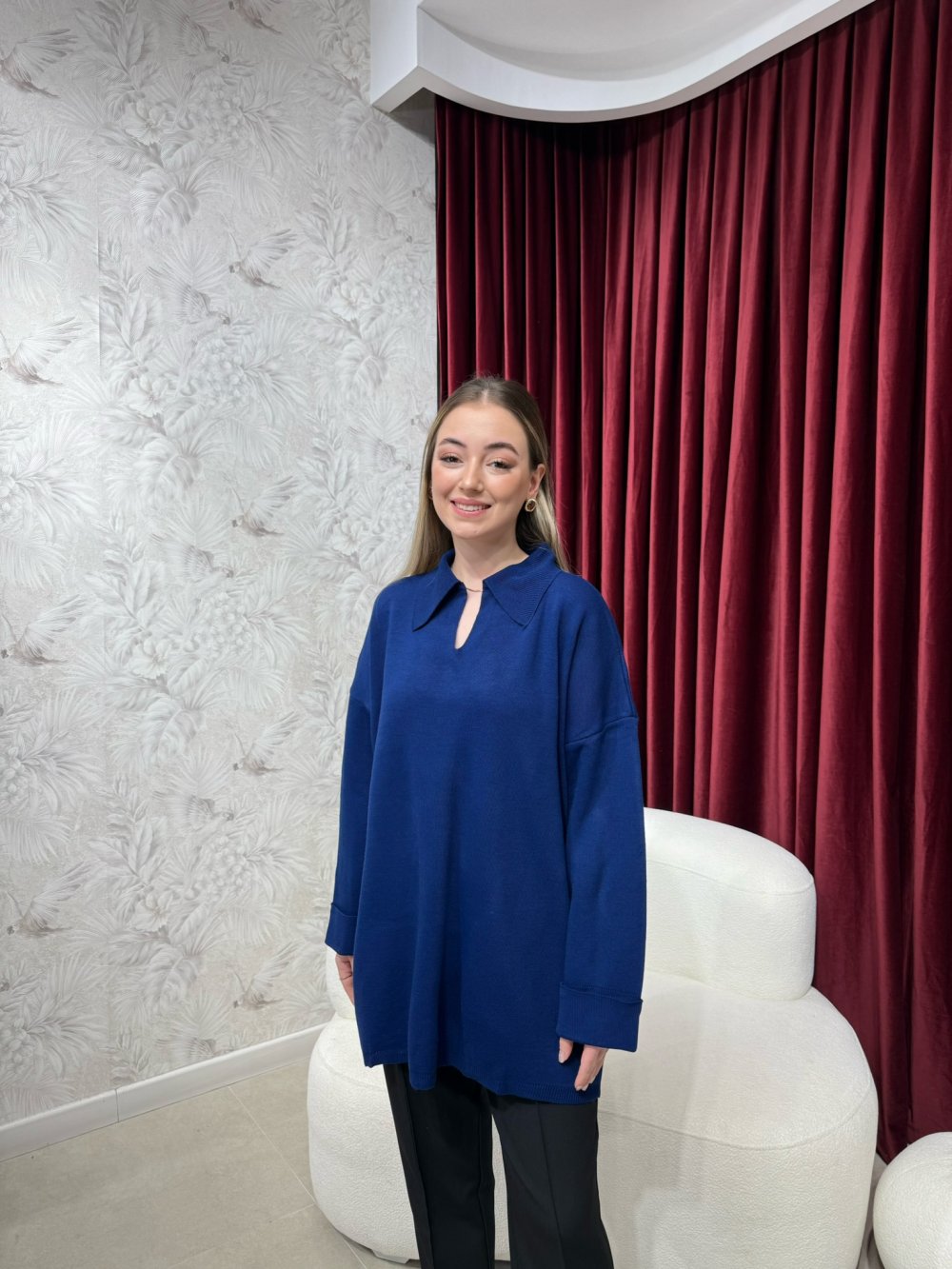 V yaka, katlama kol detaylı olup oversize kesime sahiptir.