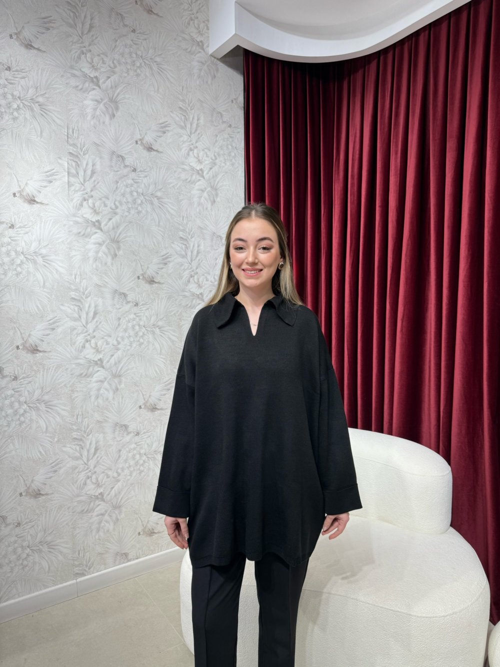 V yaka, katlama kol detaylı olup oversize kesime sahiptir.