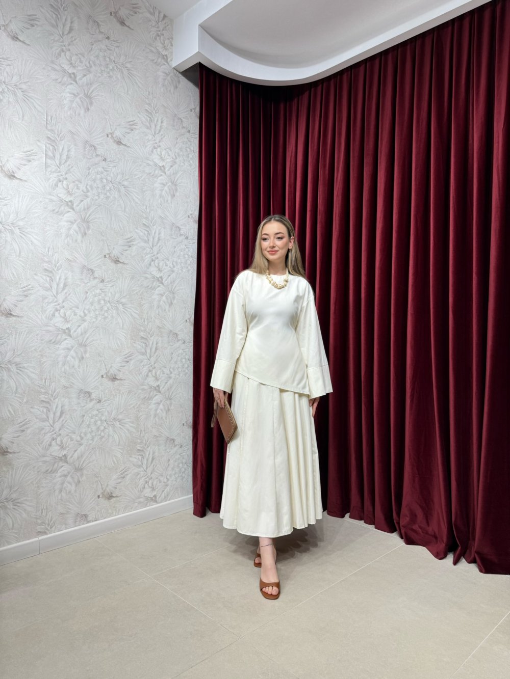 Tunik bisiklet yaka, arkadan düğmeli, yanlardan bağlamalı olup asimetrik kesime sahiptir.