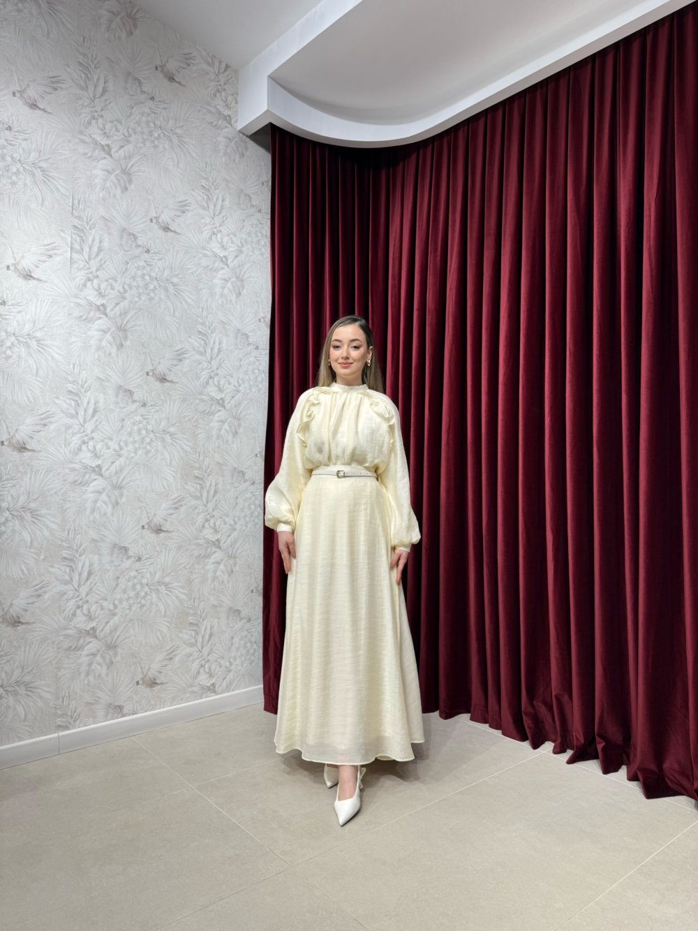Ürünümüz tensel kumaştan üretilmiştir. Tunik yuvarlak yaka,  arkadan fermuarlı, balon kol, önden fırfır detaylı olup tamamı astarlıdır.