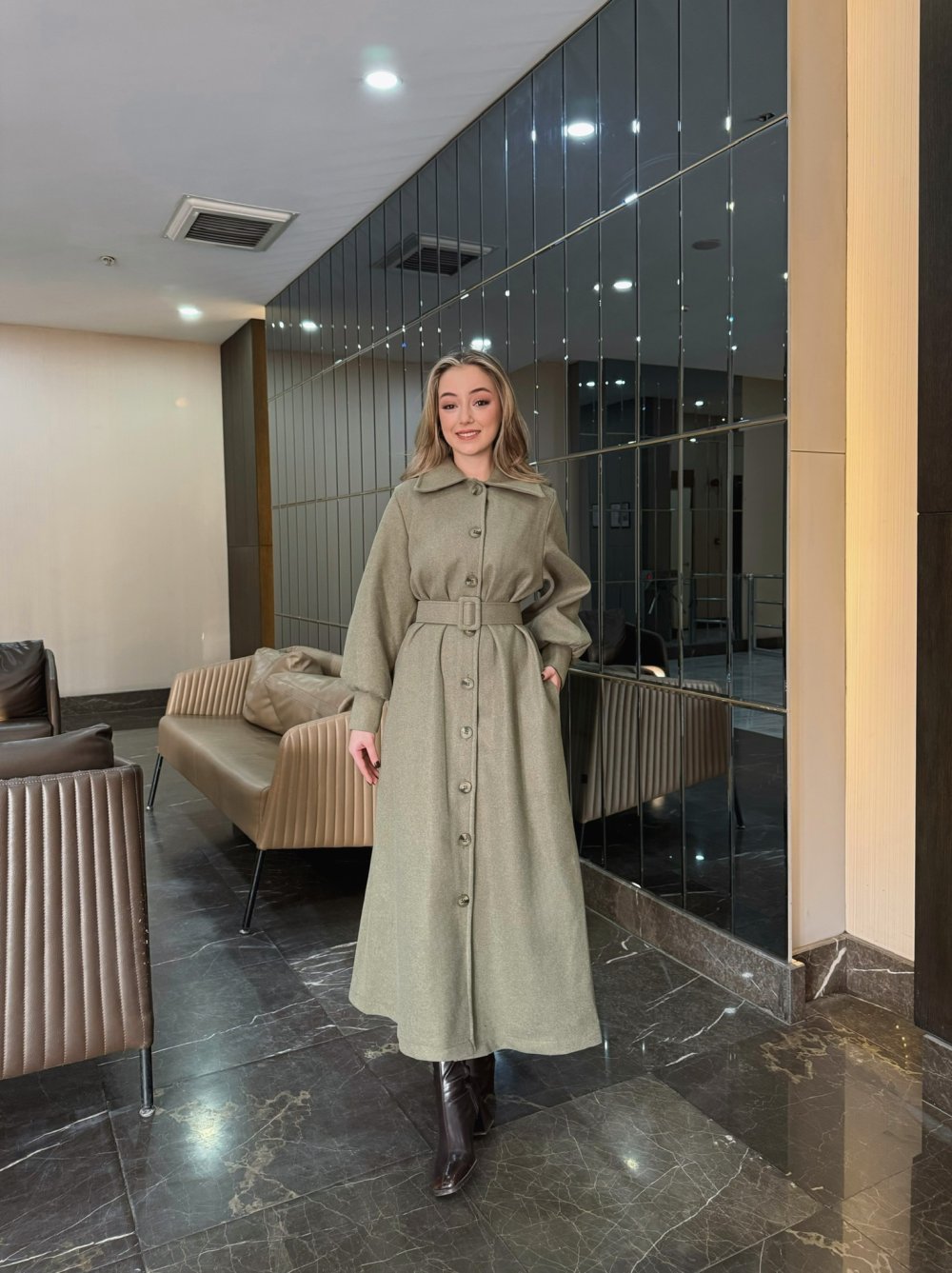 Ürünümüz kaşe kumaştan üretilmiştir. Klasik yaka, boydan düğmeli, aktif iki cepli, kol bilekleri fermuarlı olup tamamı astarlıdır. Seyyar kemer ile birlikte gönderilmektedir.