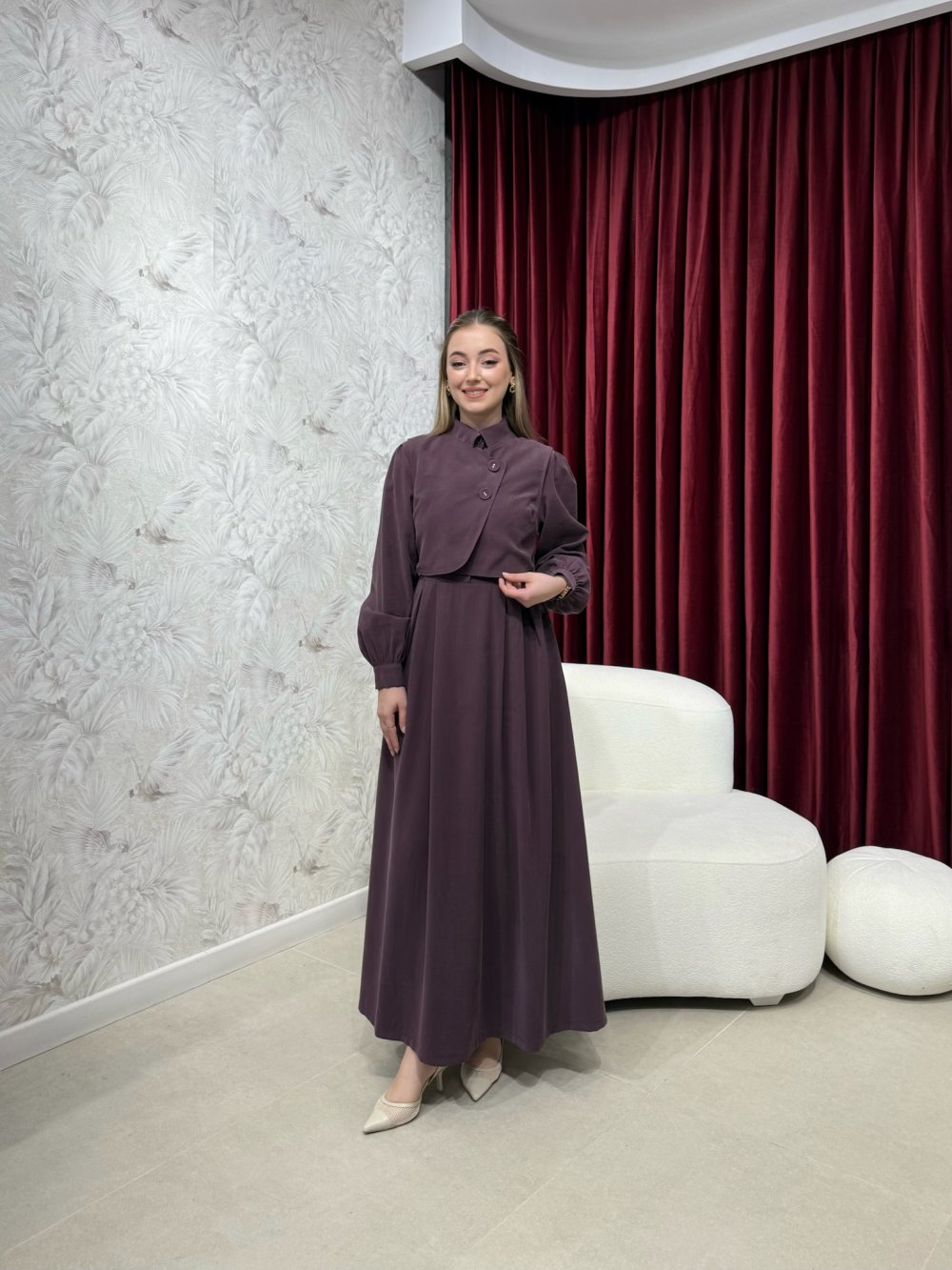 Ürünümüz modal kumaştan üretilmiştir. Klasik yaka, kollar manşetli, yan tarafından gizli fermuarlı, bele kadar düğmeli etek kısmında pile detayları mevcuttur.