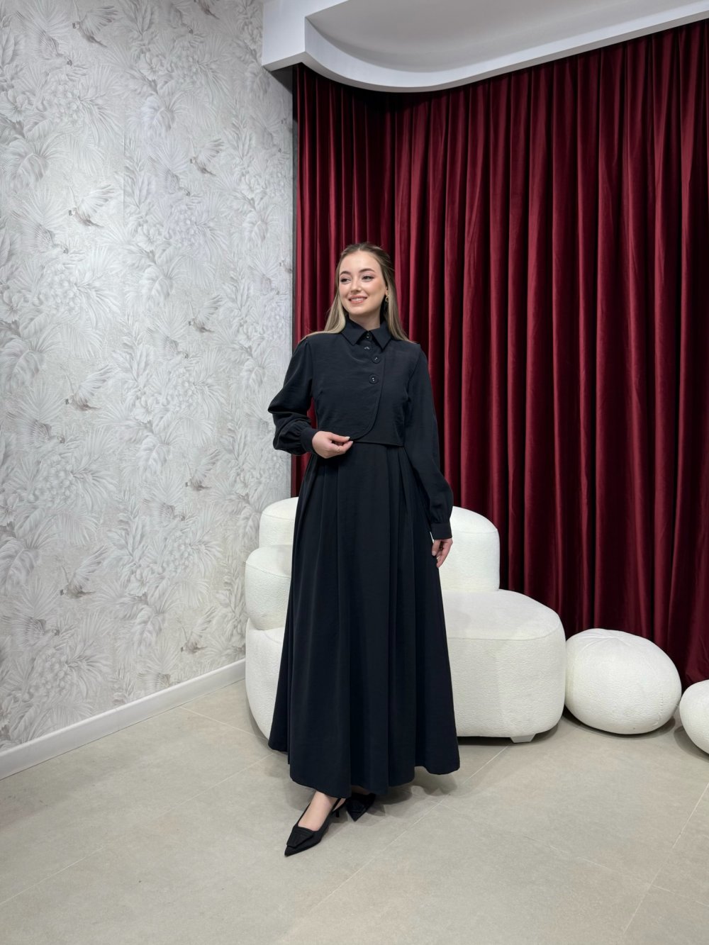 Ürünümüz modal kumaştan üretilmiştir. Klasik yaka, kollar manşetli, yan tarafından gizli fermuarlı, bele kadar düğmeli etek kısmında pile detayları mevcuttur.