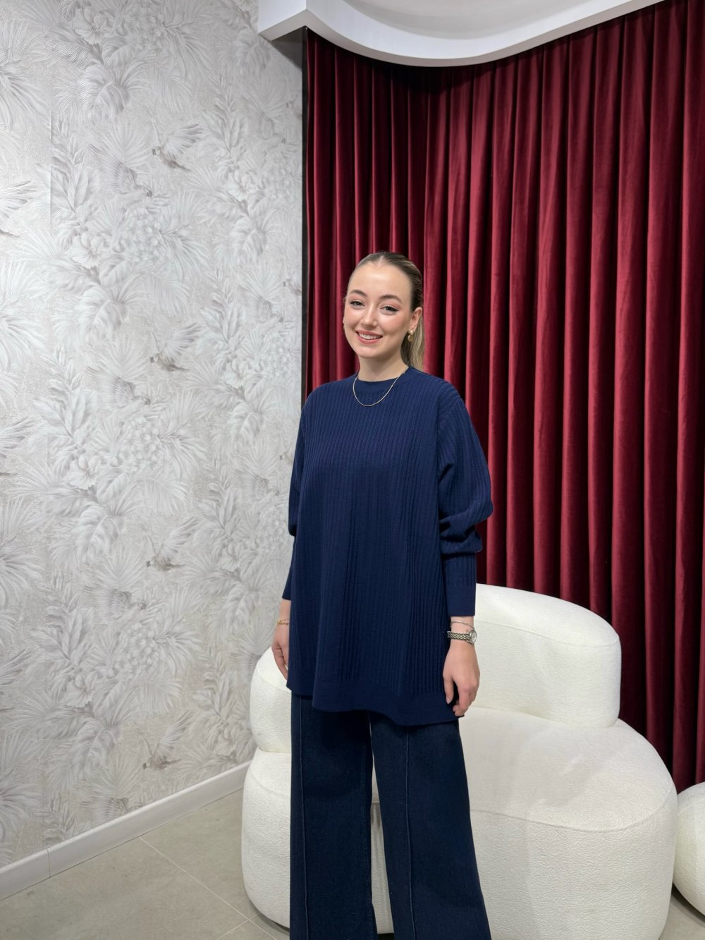 Bisiklet yaka, oversize kesime sahiptir.