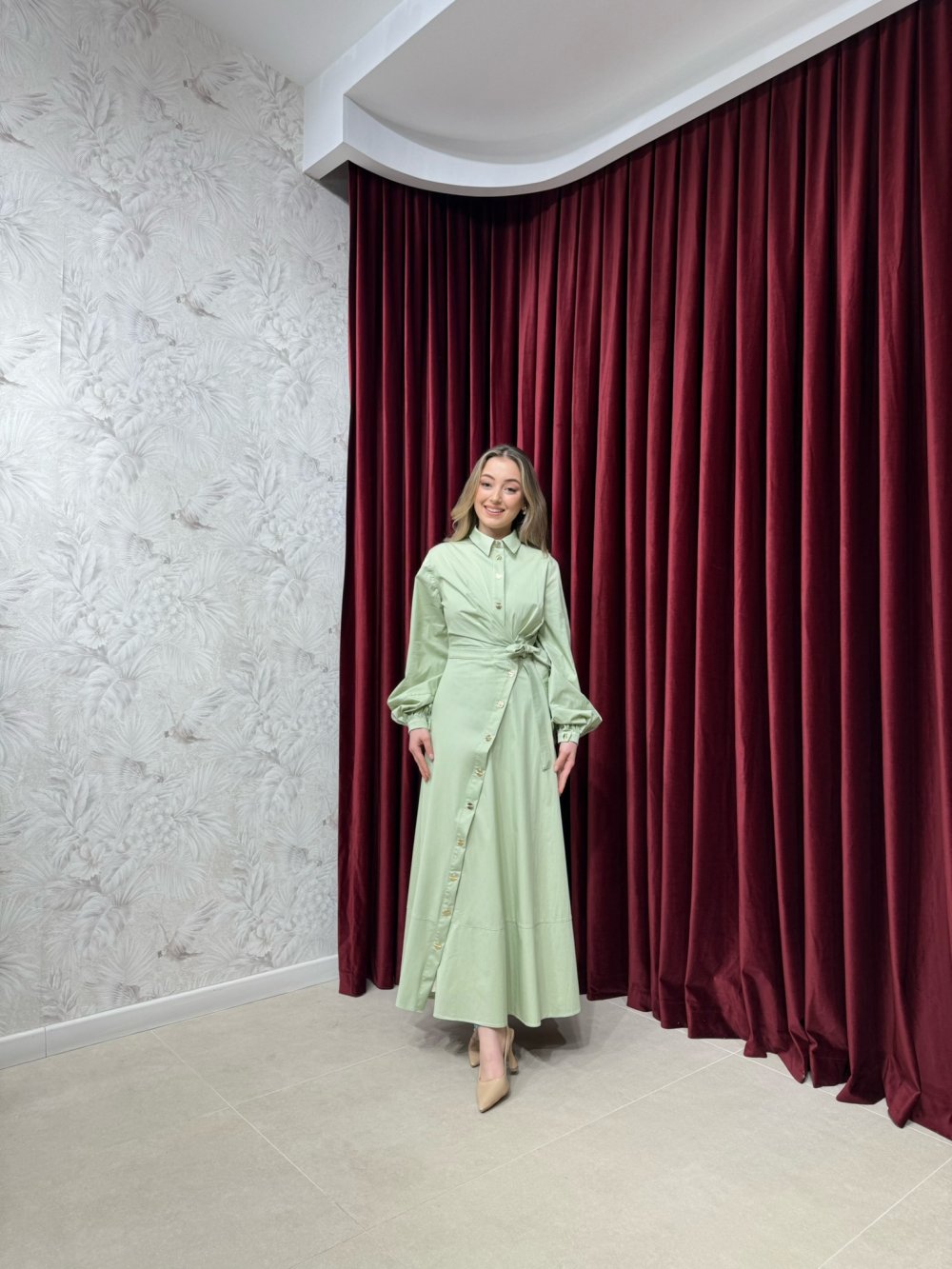 Ürünümüz poplin kumaştan üretilmiştir. Klasik yaka, önden asimetrik düğmeli, balon kol, kollar manşetli, belden bağlamalı olup astarsızdır.