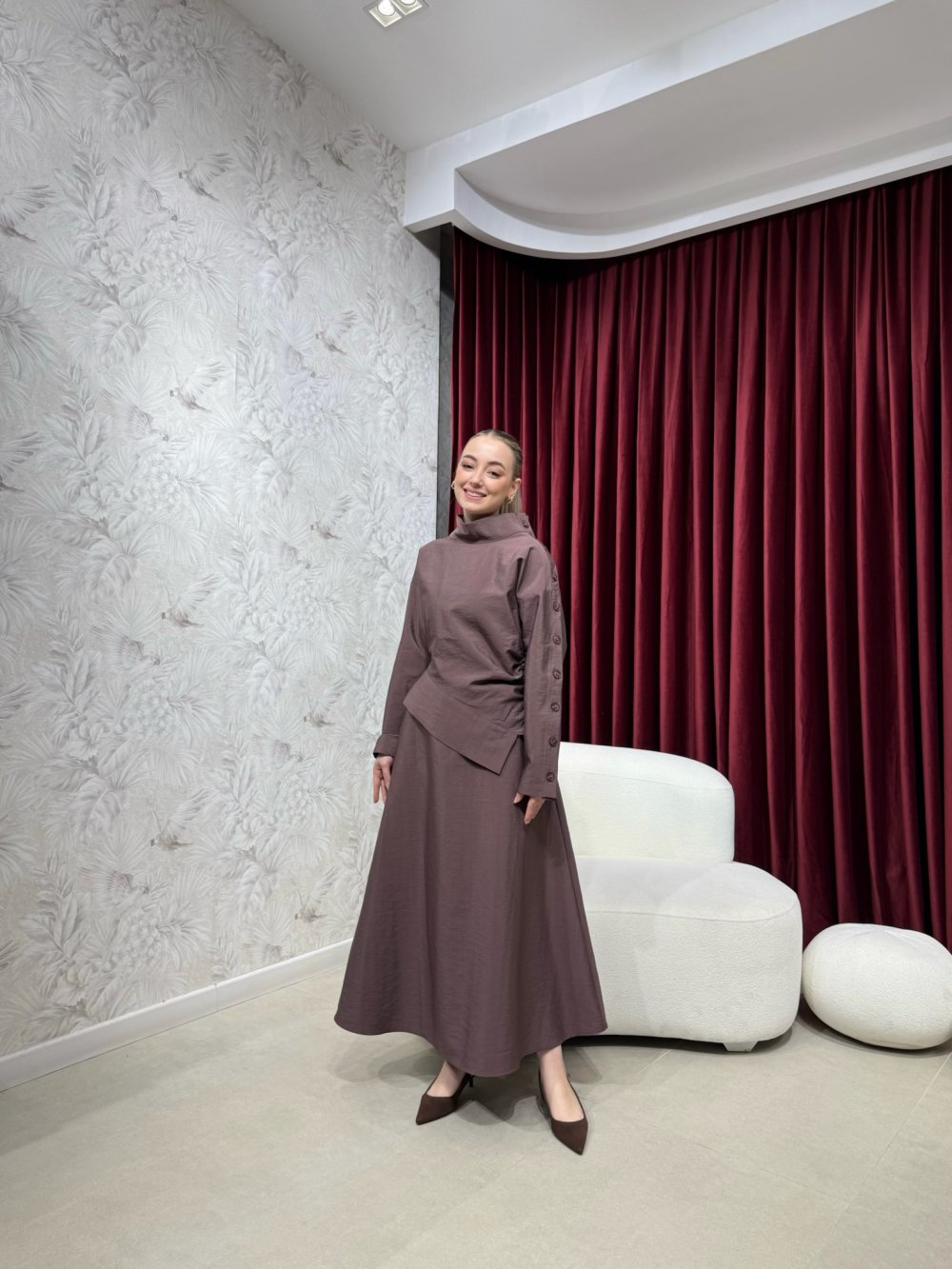 Ürünümüz cupra kumaştan üretilmiştir. Dik yaka, sol kol aktif düğme detaylı, asimetrik kesime sahip büzgü detaylıdır.