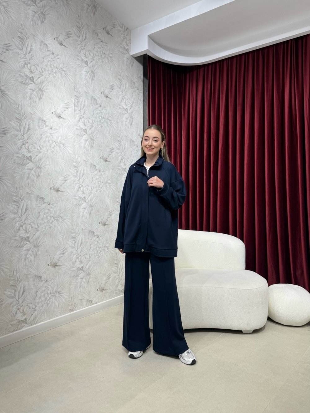 Tunik dik yaka, boydan fermuarlı, çıtçıt kapaklı, aktif iki cepli olup oversize kesime sahiptir.