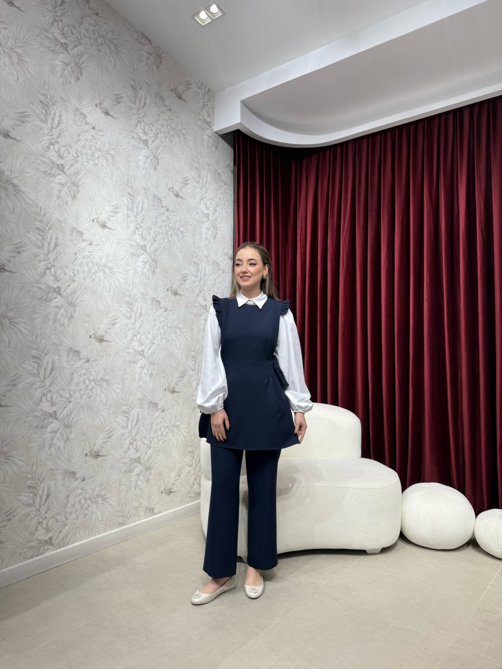 Gömlek; Poplin kumaştan üretilmiştir. Pileli dik yaka, arkadan fermuarlı olup kollar lastiklidir.
