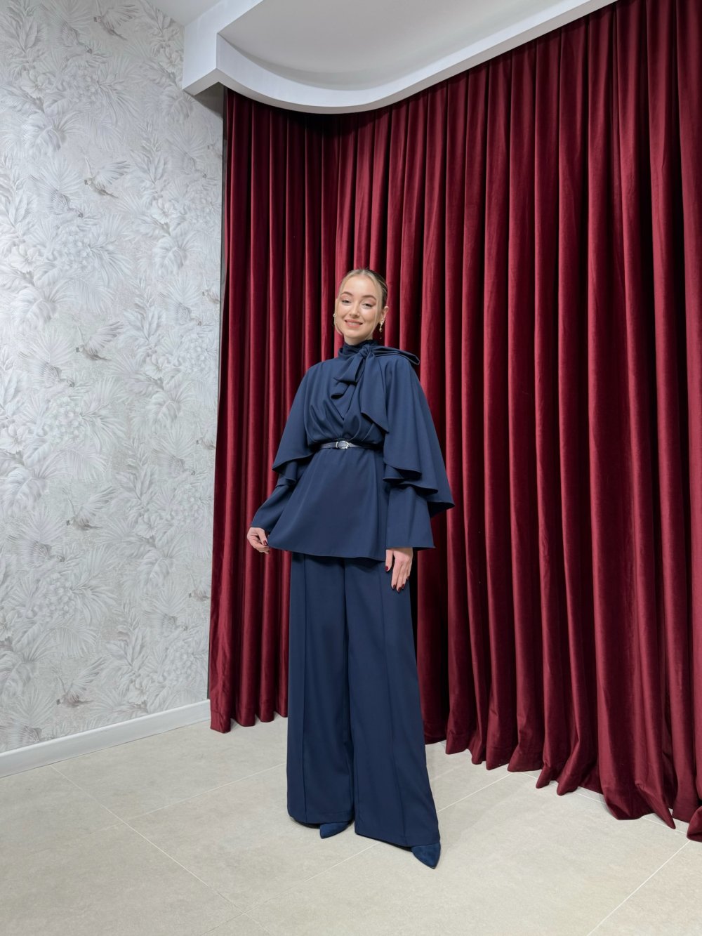 Ürünümüz krep kumaştan üretilmiştir. Tunik dik yaka, yakası arkadan bağlamalı ve fermuarlı, önden pile detaylı, arkadan pelerinli, seyyar deri kemerlidir.