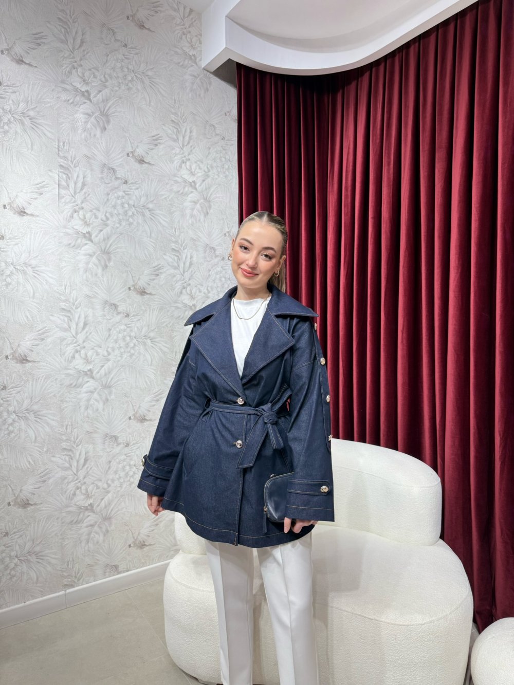 Ürünümüz denim kumaştan üretilmiştir. Büyük kruvaze yaka, önden düğmeli, omuzlar aksesuar düğme detaylı, aktif iki cepli, kollar aksesuar kemerli olup seyyar kuşak ile birlikte gönderilmektedir.