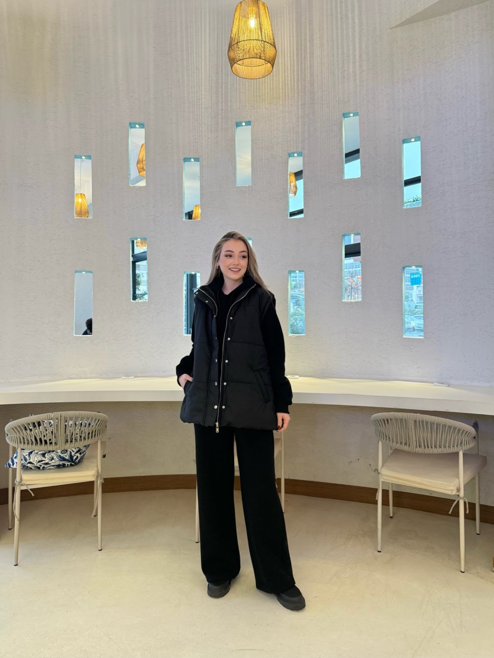 Yelek pes kumaştan üretilmiştir. Hakim yaka, boydan gizli fermuarlı ve çıtçıtlıdır.