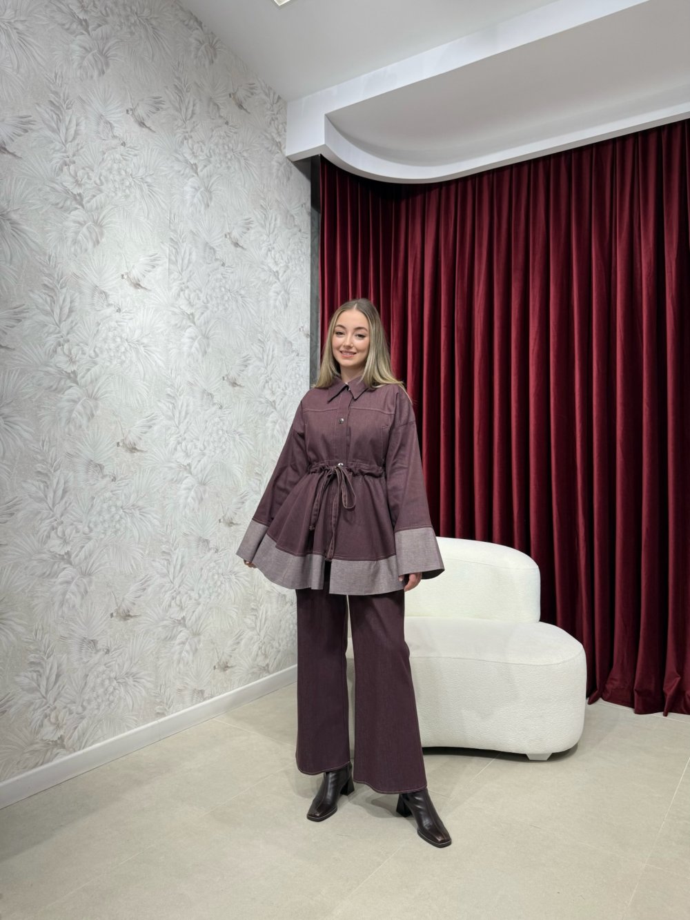 Tunik klasik yaka, boydan çıtçıt düğmeli, iki aktif cepli, belden ayarlanabilir tünel iplidir.