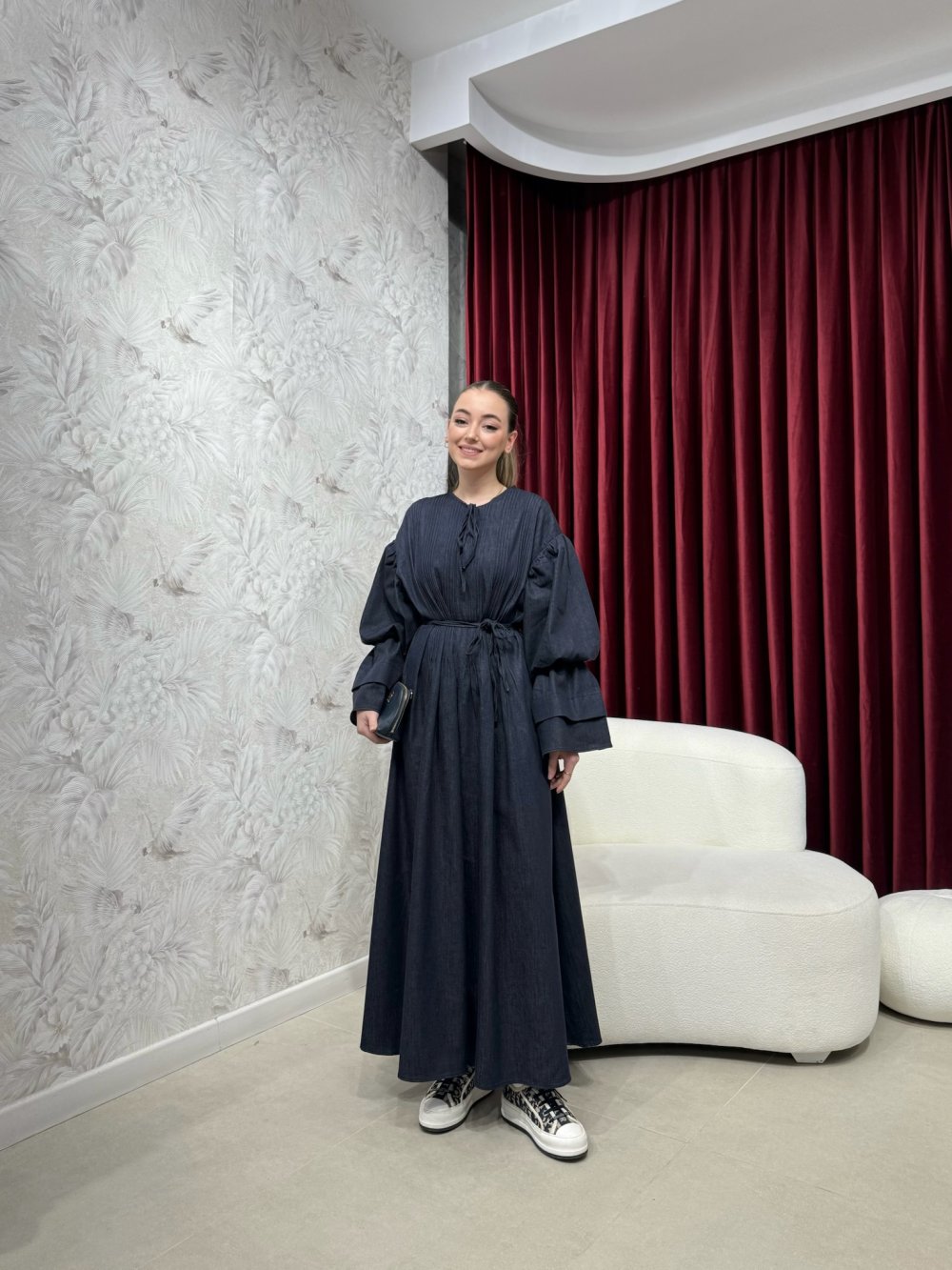 Yaka bağlama detaylı, önden pileli, balon kollu olup lastiklidir.
