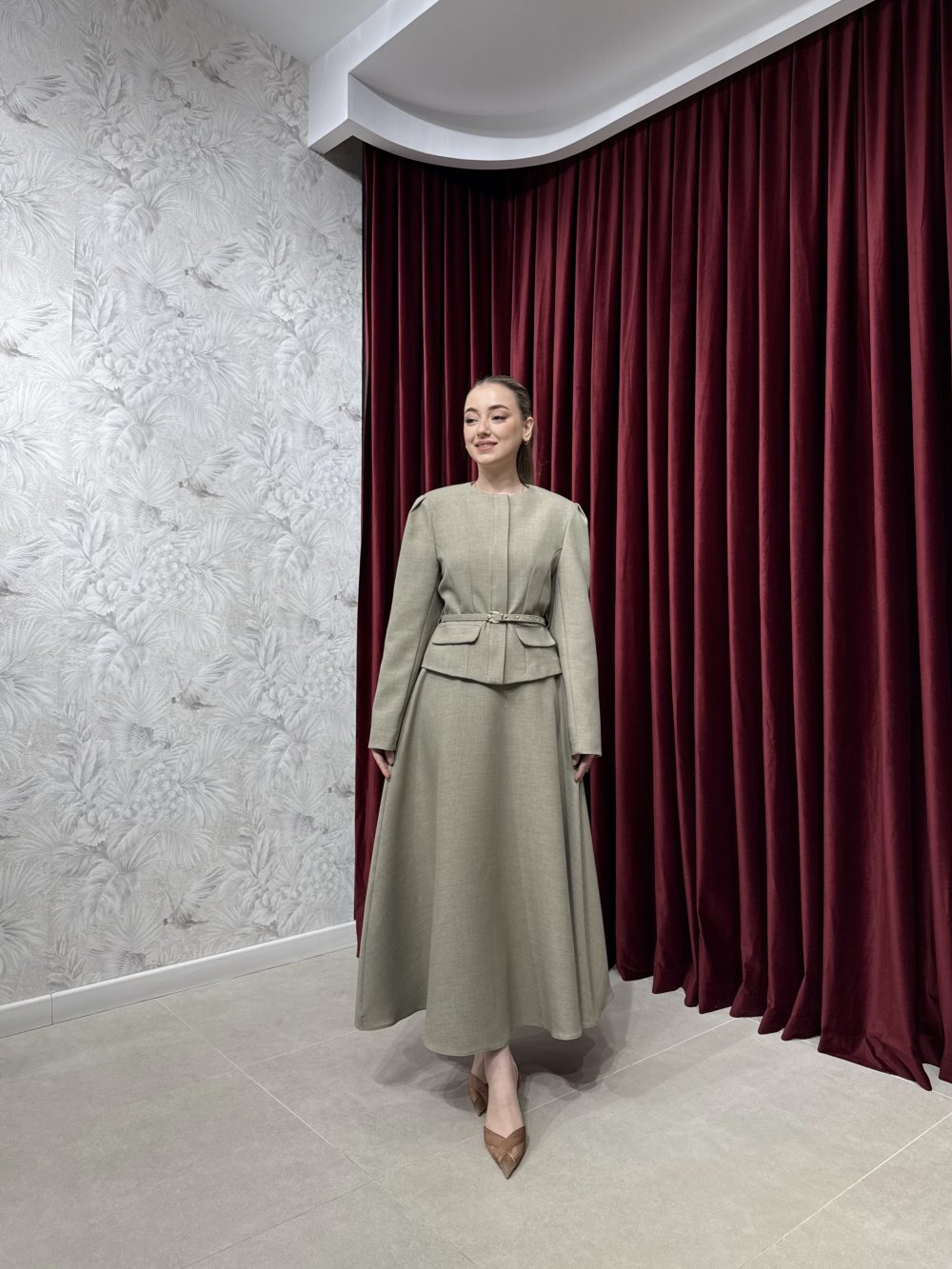 Ürünümüz natural krep kumaştan üretilmiştir. Ceket bisiklet yaka, önden gizli düğmeli, belden oturtmalı, süs cep kapaklı olup astarlıdır. Seyyar kemer ile birlikte gönderilmektedir.