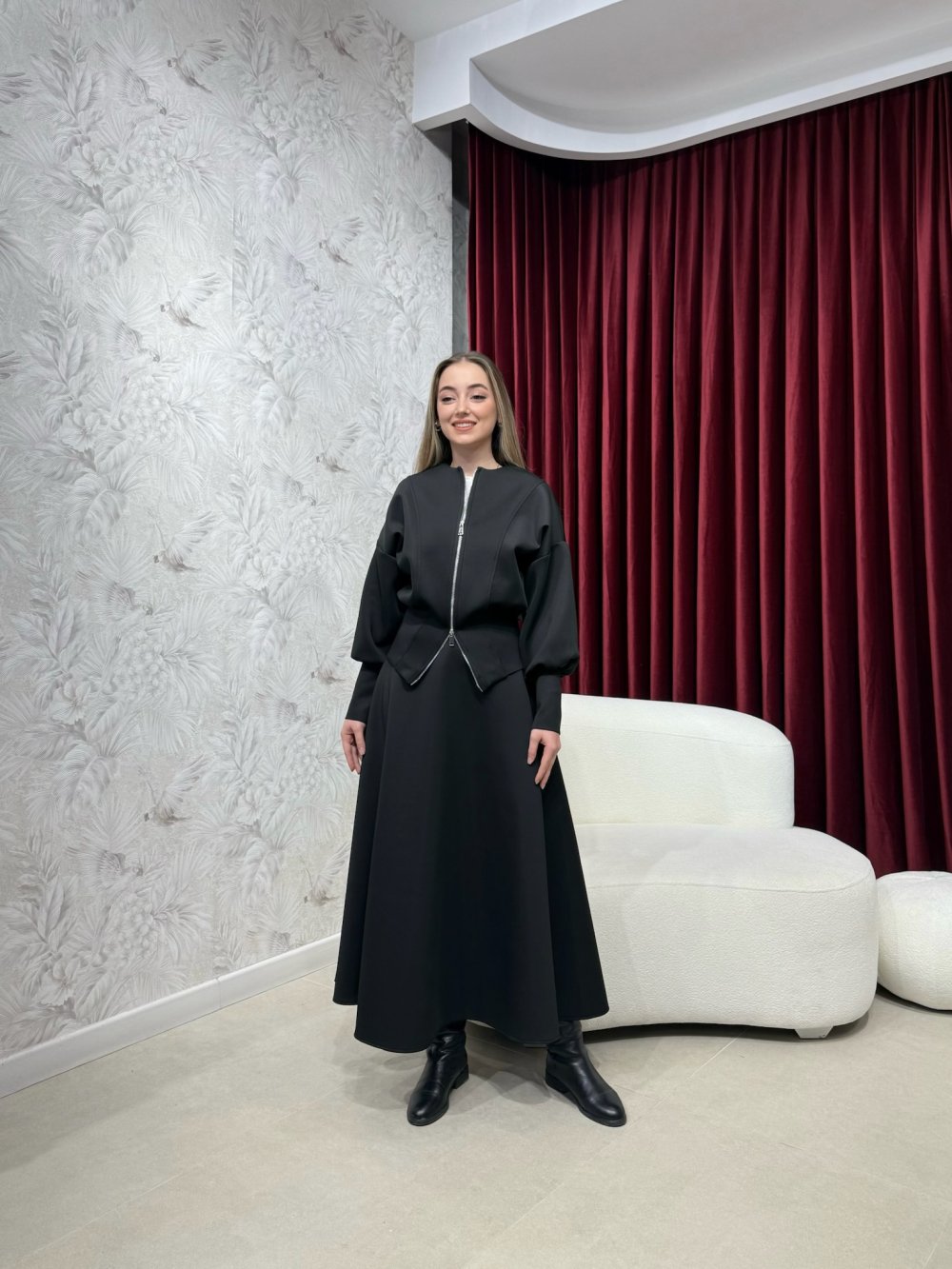 Bisiklet yaka, iki uçlu fermuarlı, düşük omuzlu olup alt kısmı korselidir.