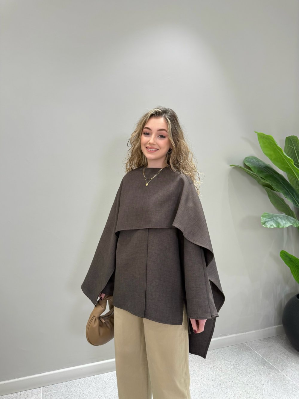 Ürünümüz natural krep kumaştan üretilmiştir. Pelerin yaka, önden bir düğmeli, yanlardan yırtmaçlı olup rahat