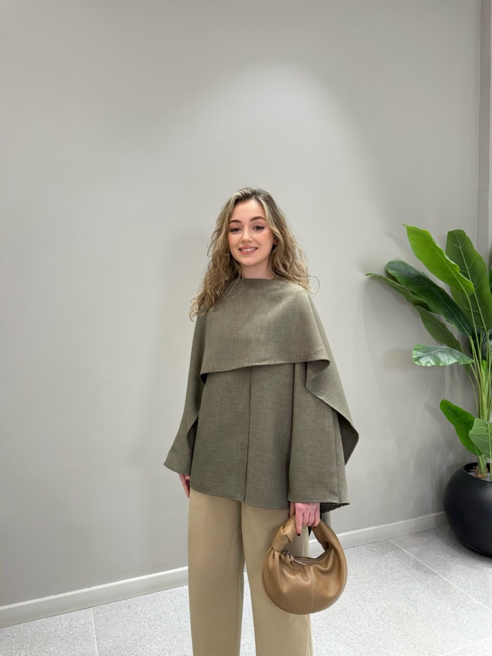 Ürünümüz natural krep kumaştan üretilmiştir. Pelerin yaka, önden bir düğmeli, yanlardan yırtmaçlı olup rahat