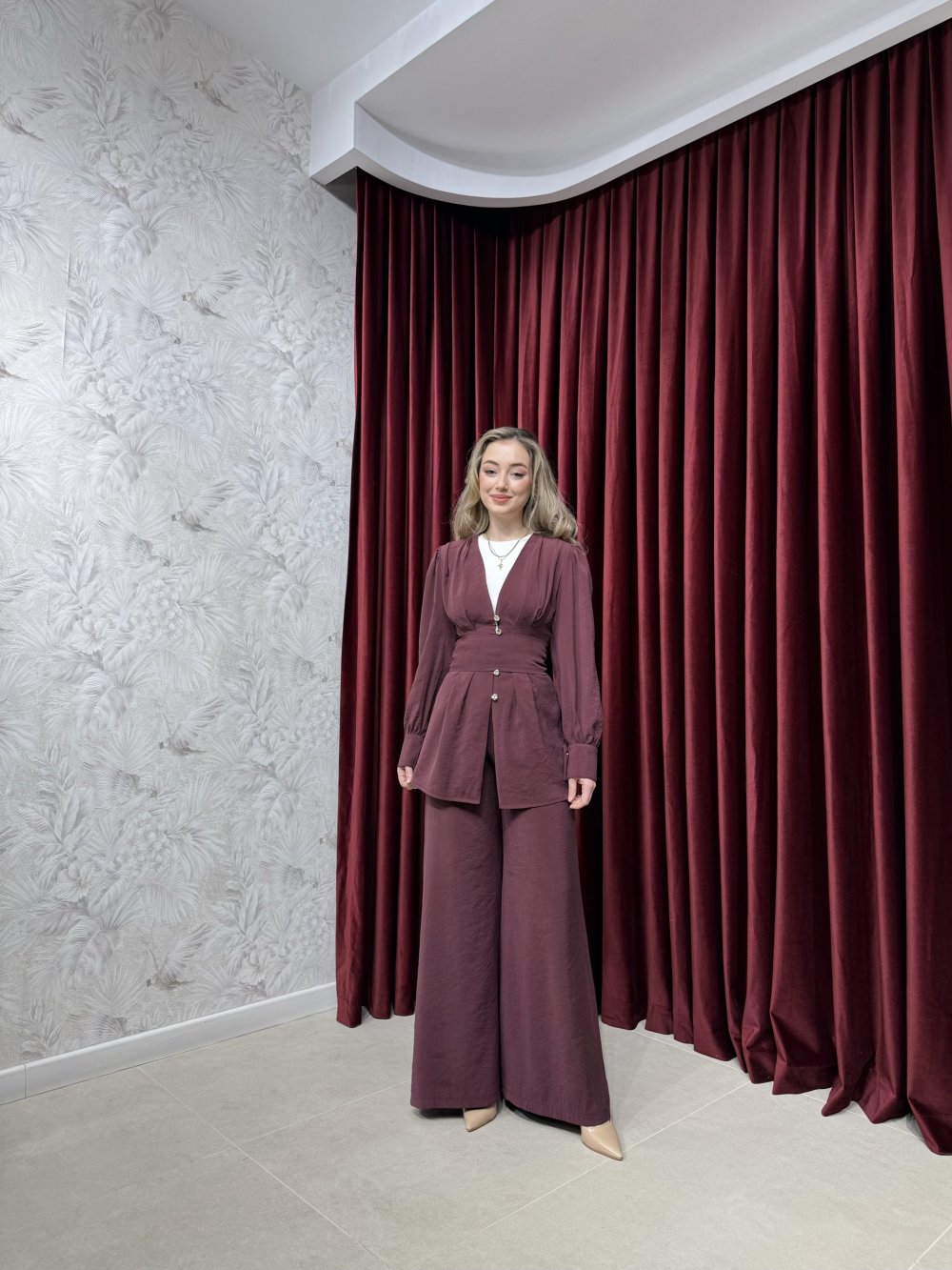 Ürünümü modal kumaştan üretilmiştir. Gömlek V yaka, boydan gold aksesuar düğmeli, belden oturtmalı olup kollar manşetlidir. Seyyar kuşak ile birlikte gönderilmektedir.
