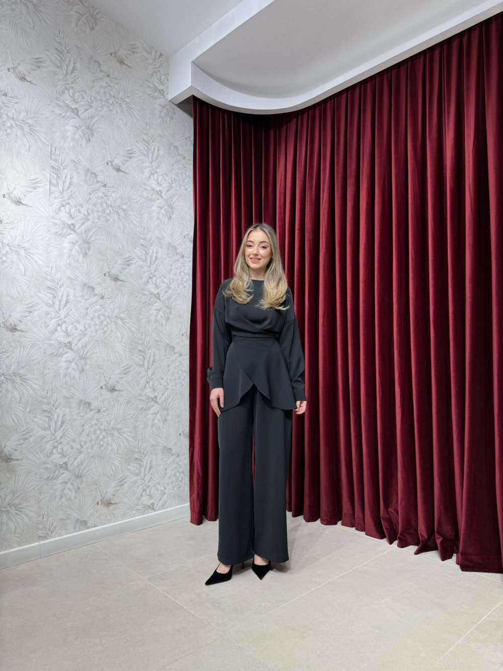 Ürünümüz krep kumaştan üretilmiştir. Tunik bisiklet yaka, arkadan fermuarlı, önden bağlama detaylı olup kollar manşetlidir.