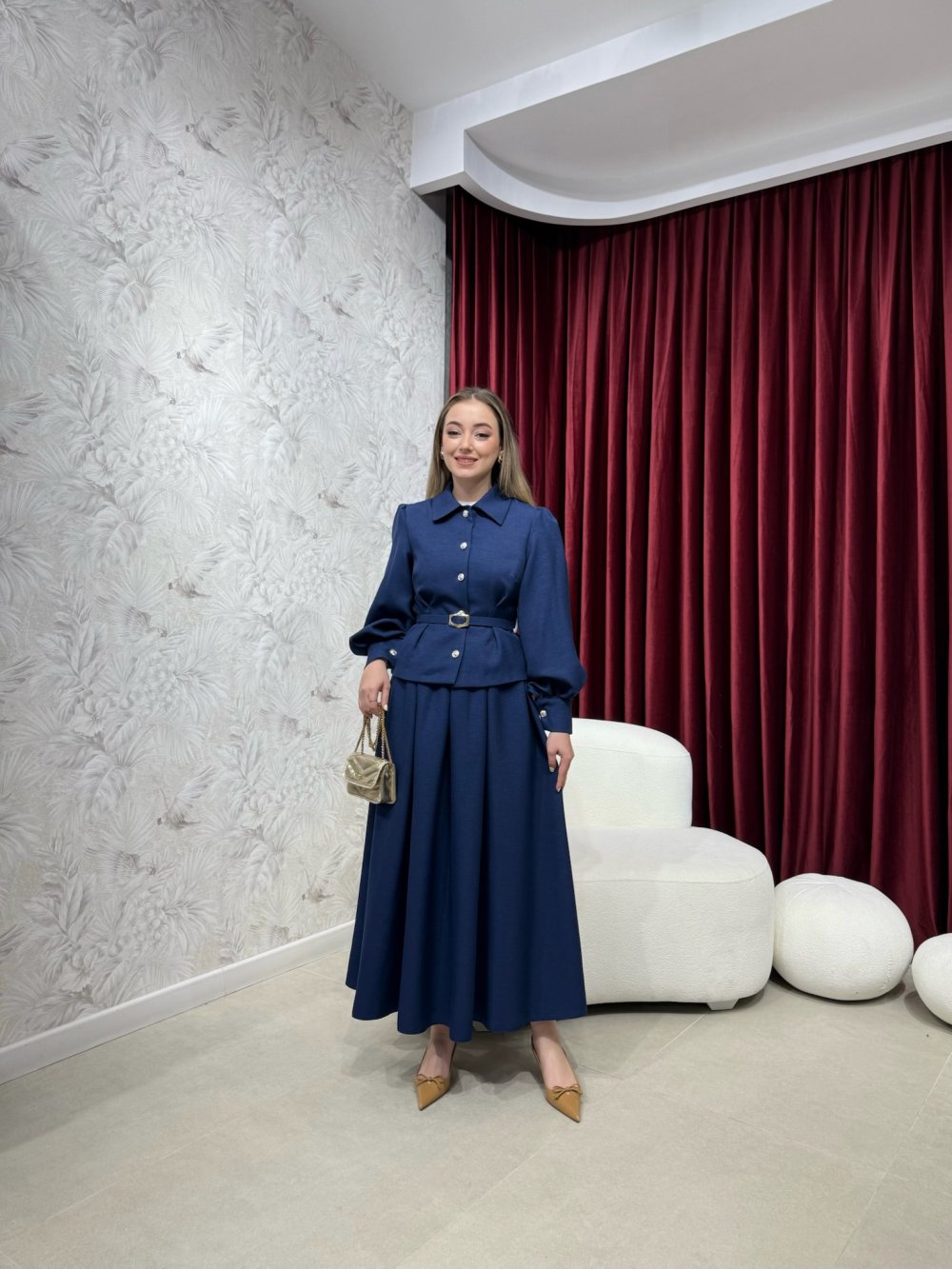 Kumaş kaplı, gold aksesuar detaylı kemer ile birlikte gönderilmektedir. Ceket içi astarlıdır.